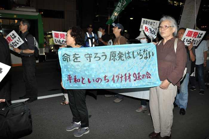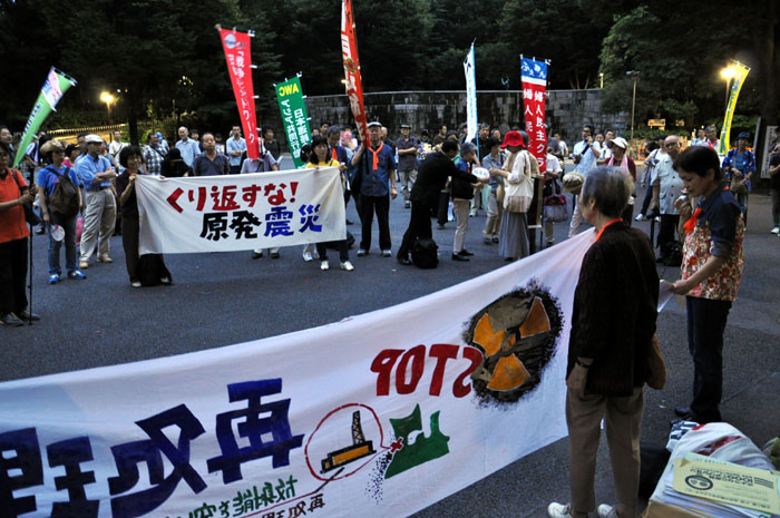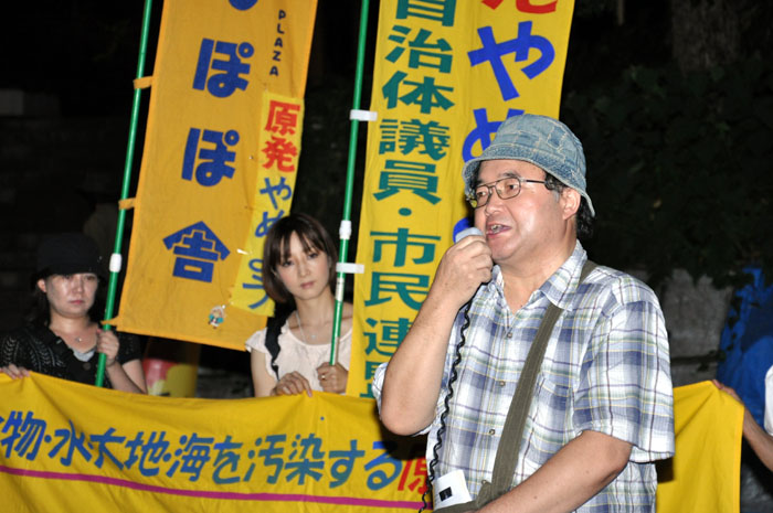 ●集合は、新宿駅西口から東京都庁の前を通った先にある、中央公園です。 ●山口泰子さん(ふぇみん婦人民主クラブ) 先日、国会内で、福島の子どもたちと政府との交渉が行われました。子どもたちの質問や意見に対して、政府の役人は無責任な回答をくり返していました。大人は責任を取らなければなりません。 放射性廃棄物も溜まる一方です。日本中に汚染物質が広がっています。脱原発の社会を作らなければなりません。 しかし人々の反応は、あまり良くありません。このデモの前に、新宿駅で、脱原発の署名活動を行いました。署名してくれた人は少なかったです。子どもを連れた若いご夫婦でも、無関心の人が多かったです。 私たちはこれからもがんばって、9・19集会を成功させて、大きな世論を作りましょう。 ●高木章次さん(プルトニウムなんていらないよ!東京) 日本には54基の原発があります。しかしその中40基が、定期点検や地震による破損で止まっています。こうした中で、玄海原発の再稼働に関しての「やらせメール」などが明らかになりました。原発を維持し続けることは無理なのです。 ●中尾さん(ワールド・ピース・ナウ) 新宿駅前での、署名行動の報告をしてくれました。 ●布施哲也さん(反原発自治体議員・市民連盟) 反原発議連について、紹介と活動報告をしてくれました。 ●デモ行進に出発です。 |