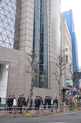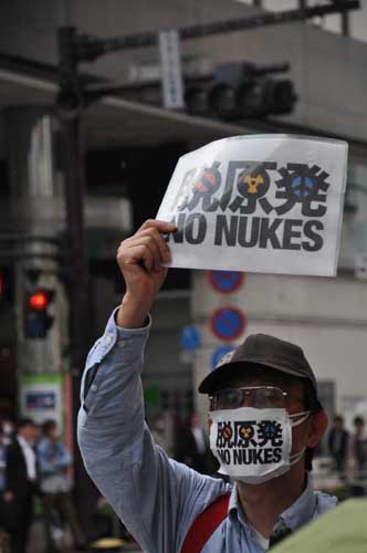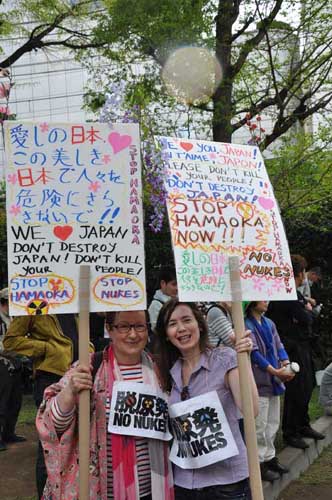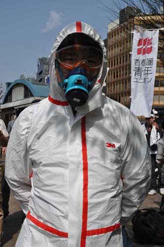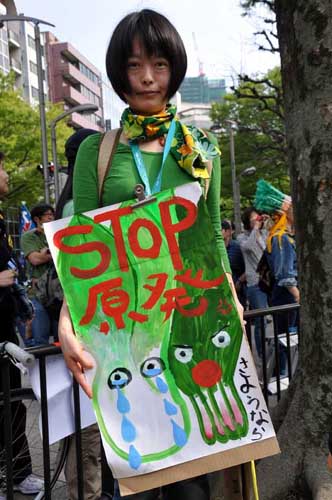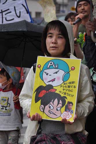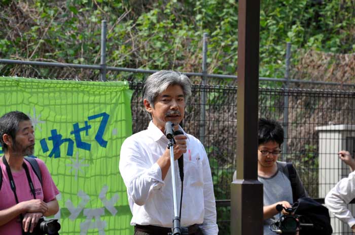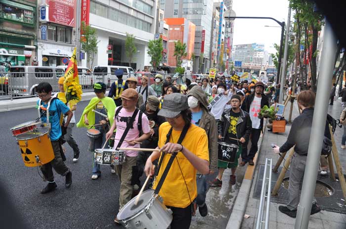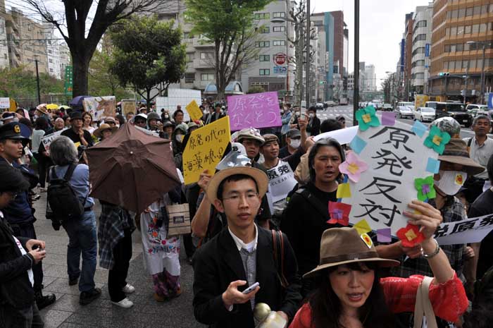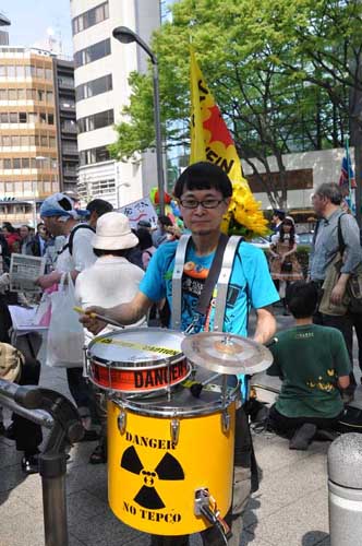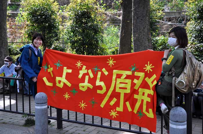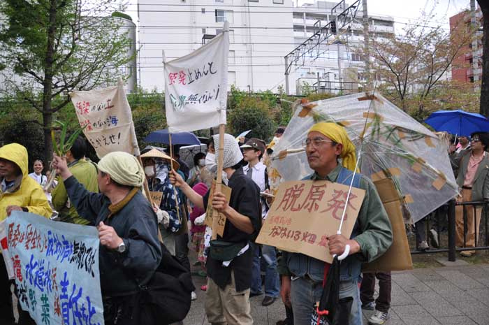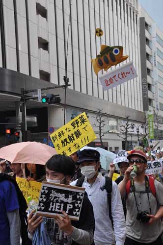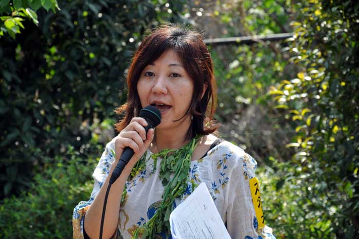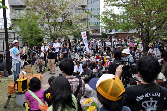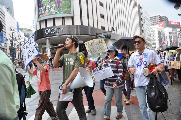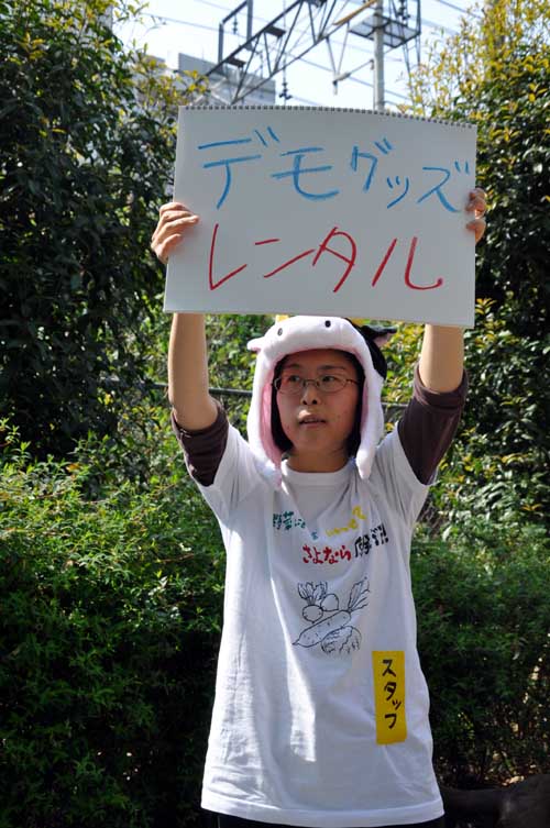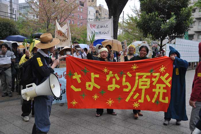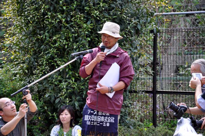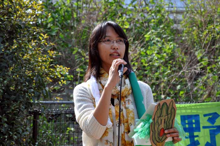 ●会場となった渋谷区の神宮通り公園。入口では、主催者の皆さんが「さよなら原発」のバナーで出迎えてくれました。 ●ウシの帽子をかぶったスタッフが、デモグッズをレンタル。 ●右手に持っているのは、ねぎです。左手のお面は、レタスかな? ●集会が始まった時点で、700人を超える人が会場にいました。 ●主催者あいさつをする内田聖子さん(PARC事務局長)。 「雨になるのを心配していました。放射能に汚染される可能性もあります。でも、私たちの願いがかなって晴天になりました。東京でも様ざまな行動が行われていますが、今日、私たちは、特に、農業や漁業に従事している人たちの立場に立って、原発反対を訴えていきたいと思います。原発による被害が最も大きいのが、農業・漁業の従事者なのです。実際の被害や、また風評被害もあり、買い控えも起きています。出荷ができない状態です。原発反対と同時に、農業・漁業従事者の声、また声を出せない野菜や魚の声を代弁して、訴えていきましょう。」 ●高田さん(GREENPEACE)。 グリーンピースでは、各国の組織から原子力の専門家を集めて放射能調査チームを組織し、2回にわたって福島現地で調査を行ったとのことです。調査の目的は、第1に政府が公開しているデータが正しいかどうかを市民の立場から検証すること、第2に住民や環境への影響を最小限にするための提言をまとめること、第3に今後行われる損害賠償に備えて市民の立場で証拠となる資料を集めること――だそうです。調査によれば、政府が公開しているデータと、グリーンピースのデータは、数値上は同じだったようです。しかしそのデータの政府の解釈には、大きな問題があるとのことでした。調査の詳細は、グリーンピースのサイトに掲載されています。 ●谷山博史さん(日本国際ボランティアセンター(JVC)代表理事)。 JVCは宮城県の気仙沼市で被災者支援を行っているとのことです。宮城県の農民も、実際の被害と風評被害の、2つの被害に苦しんでいるそうです。 谷山さんは、ある農家の人の、「もうコメを作ることができないかもしれない。田んぼの手入を夏まで行えなければ、雑草が生え田がダメになる」という言葉を紹介されました。 ●茨城県の農家の方(ごめんなさい、お名前を聞きそびれました)。 茨城では特にホウレンソウの被害が激しいそうです。注文もなく、収入は1割から2割にまで落ち込んでいるとのことです。こうした状況が風評被害の一言で片づけられがちですが、風評を受ける原因があること、その原因を丁寧に調査することが必要だとおっしゃいました。消費者が安心して野菜を買うためには、政府がしっかりしたデータを出す必要があるとのことです。また原発から20キロ圏、30キロ圏に限定せずに、損害に対しては補償するべきだと訴えました。福島や宮城など、被害を受けた他の地域の農民の先頭に立って、政府に対して、農家を保護するための政策を要求していくと、力強く発言しました。 上述の方々以外にも、たくさんの方が発言されました。 さて、少し会場の中を歩いてみました。皆さん、いろいろなコスプレやプラカードで自己表現をされています。 渋谷一周のデモ行進に出発です。 ●会場の出口では、バンドの人たちが景気づけ。 ●デモは、4つのグループに分かれて行いました。こちらは最初のグループです。 ●自称「野菜ガールズ」の皆さん。 ●ねぎを持って、元気に飛び跳ねています。 ●2つめのグループの先頭です。 ●こちらは、東京電力渋谷支社前。「原発いらない」「東電は責任を取れ」のシュプレヒコールが響きます。 ●3つめのグループの先頭は、サウンドカーでした。こちらの女性が歌を歌っていました。 ●渋谷の真ん中、丸井の前。 ●渋谷一周を終えて、神宮通り公園に戻ってきました。 ●原発を無くすための行動は、始まったばかりです。皆さん、頑張りましょう。(おわり) 写真・文書 八木隆次 |
