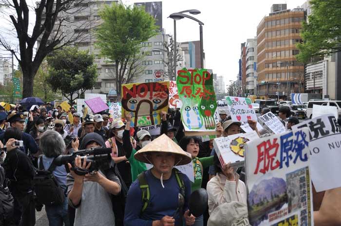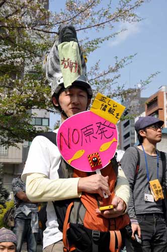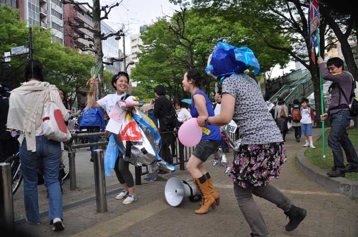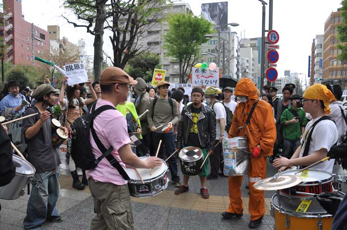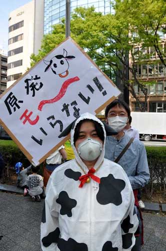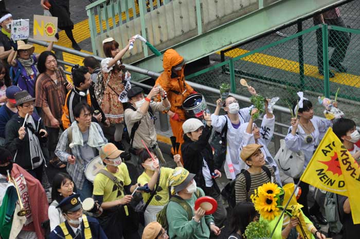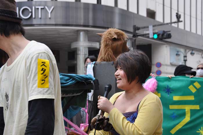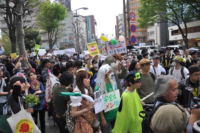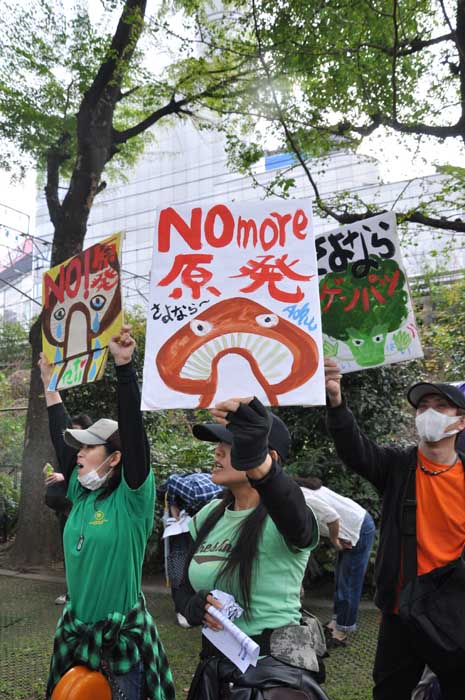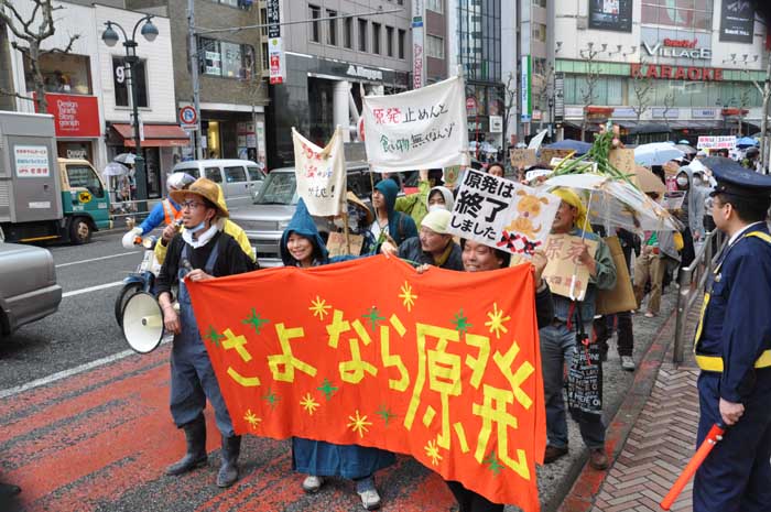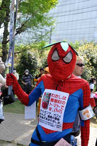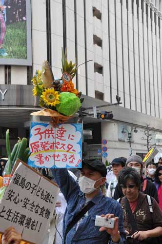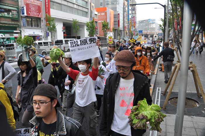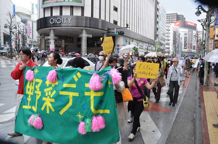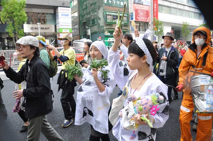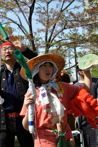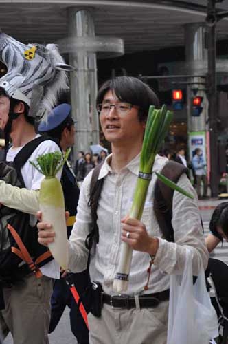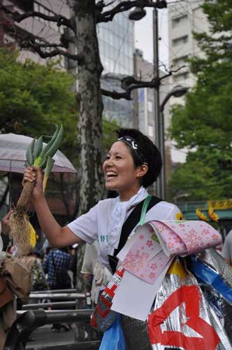東京都渋谷区で4月16日(土)、「野菜にも一言いわせて!さよなら原発デモ!」が行われ、約1500人の市民が参加しました。このデモの主催は、アジア太平洋資料センター(PARC)と、同集会実行委員会の皆さんです。主催者のサイトによると、デモの趣旨は「放射能で被害にあったり、風評被害で迷惑している野菜や魚、牛や馬など生きものの声を代弁します」とのこと。野菜のコスプレをした人、ウシのコスプレの人、サウンドカーあり、バンドありの楽しいデモになりました。また「天気予報は雨なので」と主催者を心配させていましたが、一時小雨がぱらついただけで晴天でした。