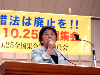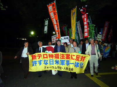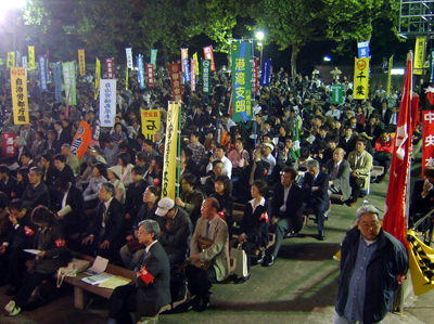 10月25日(木)夜、東京・日比谷公園野外音楽堂で、平和フォーラムと市民団体は「テロ特措法・イラク特措法は廃止を 在日米軍再編を許さない 10.25全国集会」を開催しました。集会には、平和フォーラム加盟の労働組合や民主団体、WORLD PEACE NOWに参加する市民団体など約2,000人が集まりました。以下に、集会の様子を写真でお伝えします。