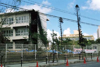 沖縄国際大学 2004年8月13日に、普天間基地のヘリコプターが沖縄国際大学に墜落した。写真は事故直後の沖縄国際大学の校舎。炎上した機体が校舎を焼き、回転するプロペラは校舎の一部を削り取った。 |
