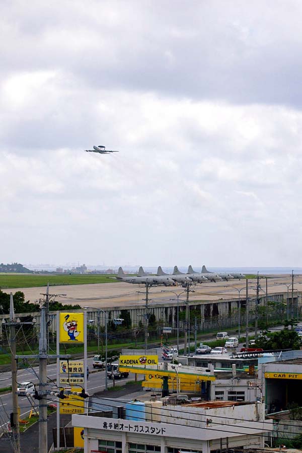 「道の駅かでな」から見た嘉手納基地。 滑走路上に並んでいるのは、海軍のP3C対潜哨戒機。飛行しているのは空軍のAWACS。 |