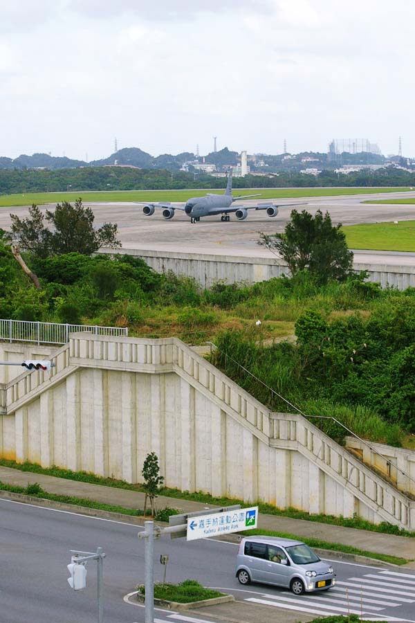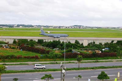 「道の駅かでな」から見た嘉手納基地。 滑走路上を走行しているのは、KC−135空中給油機。基地の手前は県道74号線で、沖縄県内でも交通量の多い道だ。 |
