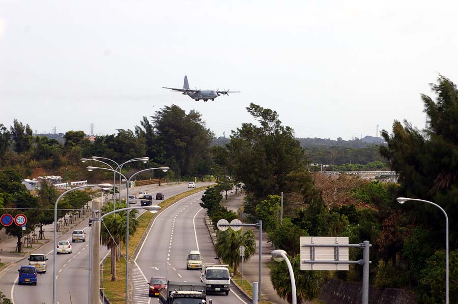 C−130輸送機が嘉手納基地への着陸に入るところ。下を通るのは県道74号線。 |