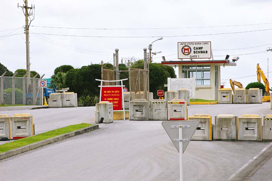 米海兵隊キャンプ・シュワブ第1ゲート前。この奥では、普天間基地の辺野古への移設のための工事が進んでいる。 |