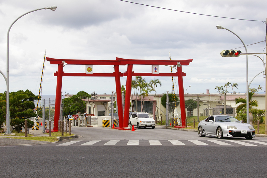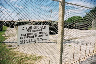 米海兵隊キャンプ・ハンセンの第1ゲート。内部には広大な訓練場があり、射撃訓練・砲撃訓練・爆発物訓練・戦闘訓練が行われている。 |