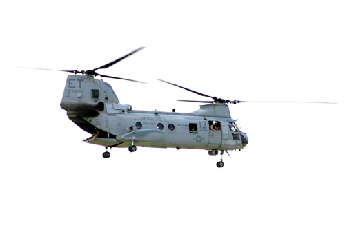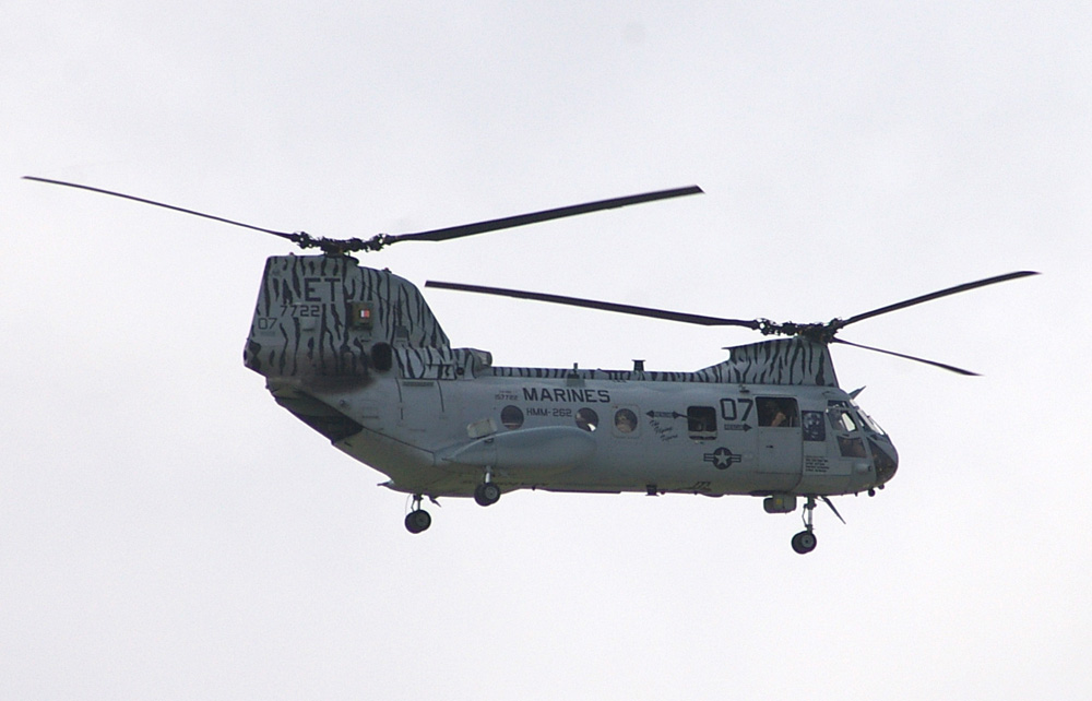 CH−46ヘリコプター 海兵隊普天間基地に駐留している 第1海兵航空団・第36海兵航空群・第262海兵中型ヘリコプター飛行隊の所属機。 (撮影場所:嘉手納基地) |