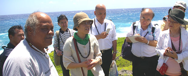 3月6日から9日、九州ブロック原水禁の19名がグアムを訪れました。沖縄海兵隊の移転先となるグアムでの視察と住民交流が目的です。いまグアムでは、基地拡張のための土地収用が進んでいます。写真は東海岸のマンギラオ。ここは射撃訓練場の予定地で、約200世帯が立ち退きを迫られています。「先祖から受け継いだ土地は渡せない、米軍が来れば闘う」とグアムの先住民・チャモロ族のデニーさん(写真・左)は語りました。