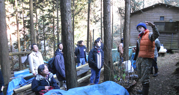 「東京にもこんなところがあるんだ!」─12月10日~11日に東京で開かれた「第42回食とみどり、水を守る全国集会」(内容8ページ)では、三つのフィールドワークも行われました。その一つとして、東京西部の八王子市で「東京の里山復活と地域資源を活かす取り組み」を視察。ここでは、市民団体と労働組合が一緒にエコプロジェクトを結成し、荒廃している里山の森林保全や、定期的な炭焼体験、地域材を使ったベンチづくりなどを市民に呼びかけて行っています。参加者は、市民が楽しみながら里山に触れる場づくりを興味深く学びました。(12月11日・八王子市のDAIGOエコロジー村)