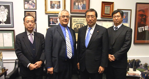 平和フォーラムの藤本泰成事務局長(写真右端)は、1月5日から10日まで、斎藤つよし衆院議員(民主党、右から2人目)、玉城義和沖縄県議会副議長(左端)らとともに訪米し、ワシントンで米政府、議会の要人と沖縄の米軍基地問題などで意見交換を行いました。政府官僚からは、普天間基地の辺野古移設が必要との見解が示されましたが、厳しい国家財政の中で、米国が世界の警察の役割を担うことをやめてその財源を国内に向けるべきとの意見も強くなっています。その中心となっている元歳出委員長のバーニー・フランク下院議員(民主党、左から2人目)とも懇談しました。