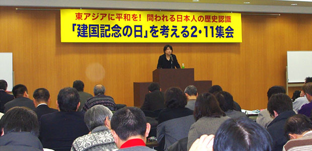 平和フォーラムは例年2月11日、戦前の「紀元節」を「建国記念の日」としていることに異議を唱え、集会を行っています。戦後の日本は、自民党内閣の下で、東アジアとの関係、とくに歴史認識について繰り返し問題を起こしてきました。政権交代後の昨年8月には、植民地支配を反省する菅首相談話が出されるなど一定の前進もありましたが、朝鮮半島や尖閣諸島をはじめ、東アジアの緊張状態は強まる一方です。本年の集会には250人が参加して、中学歴史・公民教科書などの検定が行われる問題点についての上杉聰さん(大阪市立大学教員)の講演と、適用対象から排除されたままである朝鮮学校の高校無償化問題について、東京朝鮮学校オモニ会連絡会代表の厳廣子(オム・グァンジャ)さんの提起と訴えを受けました。