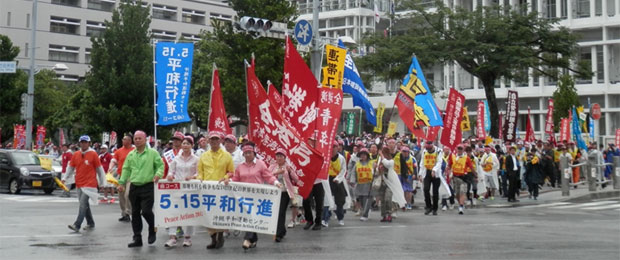 復帰41年目の5.15沖縄平和行進は、5月16日の結団式に続き、5月17日の早朝から東・西・南の3コースで行進がスタートしました。那覇市役所前で行われた南コースの出発式には400人の参加者が集まり、平和行進実行委員会の崎山嗣幸委員長が「沖縄を切り捨てた日である1952年4月28日を日本の主権回復の日として祝い、オスプレイの普天間基地撤回を求める全沖縄の訴えに対して何ら顧みることなく、憲法改悪に走り出している安倍政権に強い抗議の意思を示す行進となるよう、がんばろう」とあいさつ。また橋下徹大阪市長をはじめとする日本維新の会と自民党の政治家が、相次いで「従軍慰安婦」について差別的な発言をしている問題に対して「戦争を擁護し、女性をそして男性を蔑する典型的な思想であり断じて許すことは出来ない」と来賓らが訴えました。沖縄から基地と戦後体制を告発する平和行進が始まりました。(写真は6月17日の那覇市役所前での出発式)
