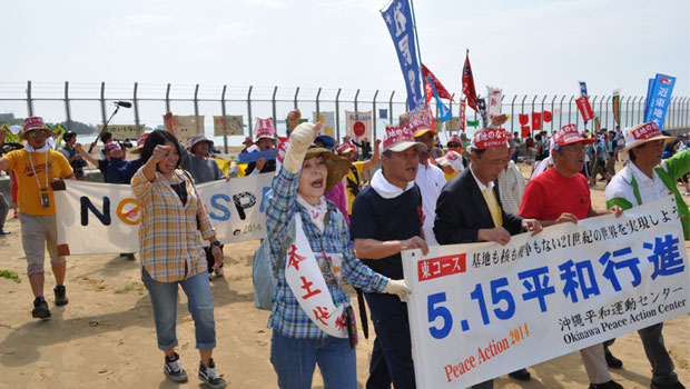 沖縄が日本に復帰してから42年目となる5月15日、第37回沖縄平和行進結団式が那覇市内で開催されました。おりしも安倍首相の私的諮問機関である「安全保障の法的基盤の再構築に関する懇談会」から集団的自衛権行使を容認する報告書が提出され、首相が憲法解釈の変更を表明した日と重なりました。沖縄の県内紙は「憲法の輝きはまさに沖縄の『道標』であった。しかし今、その道標は安倍政権によって葬られ、墓標が立とうとしている。再び戦争への道を開きかねない集団的自衛権の行使容認の見解表明は、沖縄が再び戦場にならないかという恐怖を呼び起こす」と社説で記しています。