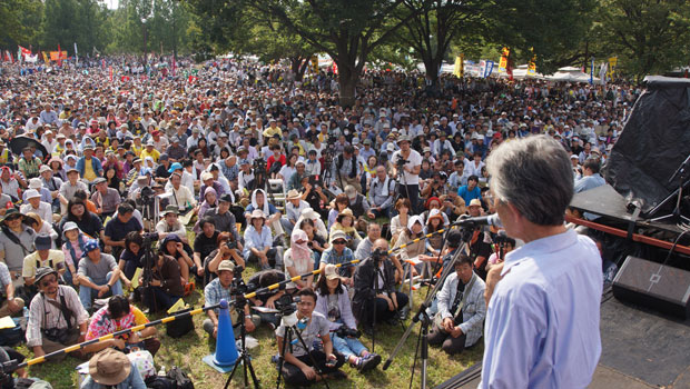 韓国や台湾からも脱原発に向けた運動が報告され、集会後、参加者はプラカードや横断幕などを手にデモ行進しました。会場周辺には多くの団体のブースが並び、原発立地地域からの訴えや関連物資の販売、署名活動など多彩な活動が行われました。(写真は会場を埋め尽くす参加者、撮影=今井明)