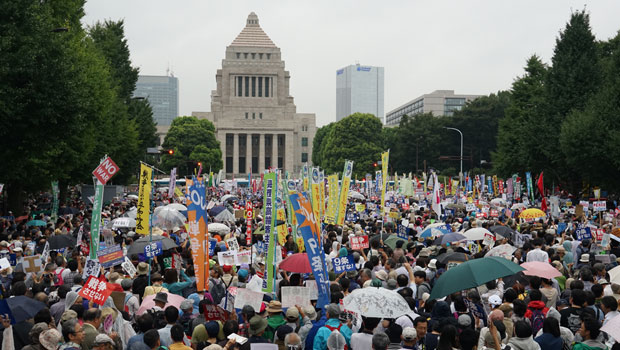この戦争法案によって、日本の安全保障の抑止力は一段と高まるとする安倍首相の主張は、詭弁以外の何ものでもない。アメリカと一体化する自衛隊の軍事的活動は、多くの敵対国をつくり、日本人への憎悪さえ生み出すこととなる。日本国内でのテロ行為を誘発する可能性も高まる。安倍首相の言う「積極的平和主義」は、私たちの命を積極的に脅威へと誘うものでしかない。平和フォーラムは、誰も戦地に送ることなく、人を殺すことなく、殺されることのない日本を守り抜く。そのために、平和を愛し民主主義を尊ぶ多くの市民とともに、闘い続けることを決意する。(9月19日付け平和フォーラム声明より)(写真は8月30日の国会包囲行動/撮影・今井明)