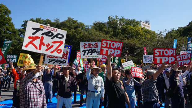 10月15日に東京・芝公園で「TPPを批准させない!一万人行動」が開かれ、全国から8000人が参加しました。平和フォーラムなど270団体が賛同団体として結集し、臨時国会での環太平洋経済連携協定(TPP)の批准を止めようと決意を固めました。呼びかけ人を代表し、主婦連合会参与の山根香織さんは「TPPは、農業や食の安全を壊し、医薬品の高騰など問題だらけだ。暮らしを守るため声を上げよう」と訴えました。野党4党の代表からも「TPPは自由貿易ではなく、多国籍企業のための管理貿易体制を作るものだ。アメリカも批准していないものを、日本はどうして急ぐのか」(福島みずほ社民党副党首)などと、阻止に向けて国会内で闘う決意が表明されました。各地・各界からのリレートークも行われ、最後に「情報開示も十分な審議もないまま、TPP協定の批准を今国会で強行することは絶対に反対」と集会アピールを採択。集会後、参加者はのぼり旗やプラカードなどを手に「日本の農業、食の安全を守ろう!」「暮らしをこわすTPPはいらない!」などと、シュプレヒコールをしながら、デモ行進でアピールしました。(写真は気勢をあげる参加者)