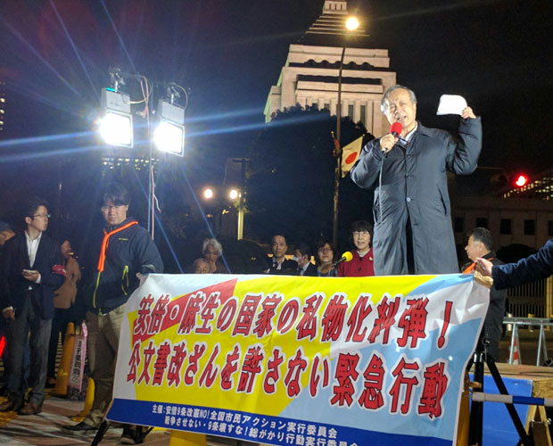 この沖縄で挙げたこぶしと声は、全国を貫き、国会前で安倍政権に抗議する人びととも合流していった。森友学園問題にかかわる決裁文書の改ざん、このありえない国家の犯罪に人びとの怒りは渦巻いている。(下写真3月15日・国会前行動)