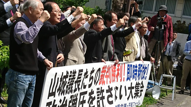 夏を思わせる日差しが照りつける城岳公園(那覇市)に、燃えたぎる怒りを突き上げるこぶしと歌声が響き渡った。3月14日に那覇地裁が山城博治沖縄平和運動センター議長らに下した不当判決は、運動の圧殺をねらった国家の暴力を認めたものにすぎない。再び沖縄を戦場にすることは許されない、辺野古に米軍の新基地建設はいらないとする県民の民意に、あらゆる手段でたちはだかってきた国家の暴力に対する、市民らのささやかな抵抗が罪とされたのだ。
