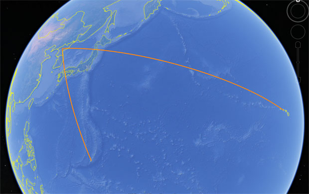 新屋演習場(秋田市)とむつみ演習場(山口県萩市、阿武町)に配備する方針の地上配備型迎撃ミサイルシステム「イージス・アショア」。山口県と秋田県に弾道ミサイル防衛基地をつくる理由は、北朝鮮からグアム、ハワイの米軍基地へ地球儀の上で線を引いてみると判明します。上の図は、北朝鮮北部慈江道の2017年7月28日「大陸間弾道ミサイル(ICBM)」発射地点からデジタル地球儀で地上に線を書いたものです。この線の上空を通るような軌道で弾道ミサイルが飛んだ場合、秋田・山口上空では高度数百kmで、イージス・アショアで使われる予定の日米が共同開発する迎撃ミサイルSM-3ブロックIIAでは、ちょうど米国ミサイル防衛庁の想定するイージス弾道ミサイル防衛の範囲にあたります。実際に迎撃できるかは別問題で、「成功した」とする実験も実際のミサイル攻撃の状況とはかけ離れた設定によるものです。「24時間365日、日本全域を守り続けることができる」とする防衛省の主張には何の裏付けもありません。
