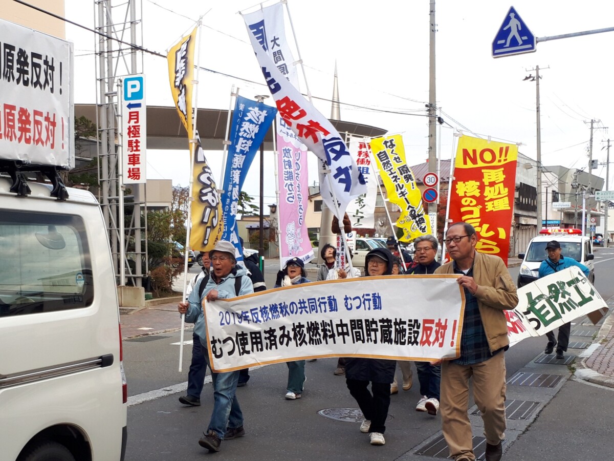 私たちの会も多くの仲間と共にこの問題については青森県知事やむつ市長へ申入書を提出しながら、様ざまな機会をとらえて市民へ訴えています。この共用問題は青森県を核のゴミ捨て場にしようとする意図であることはもとより、単に当むつ市だけの問題ではなく全国の老朽化原発の再稼働に道を開き、結果として全国の原発立地地域の住民を一層危険に晒すことに加担することになることを強く訴え、そうした観点からも青森県やむつ市への共用化を認めないよう申し入れています。