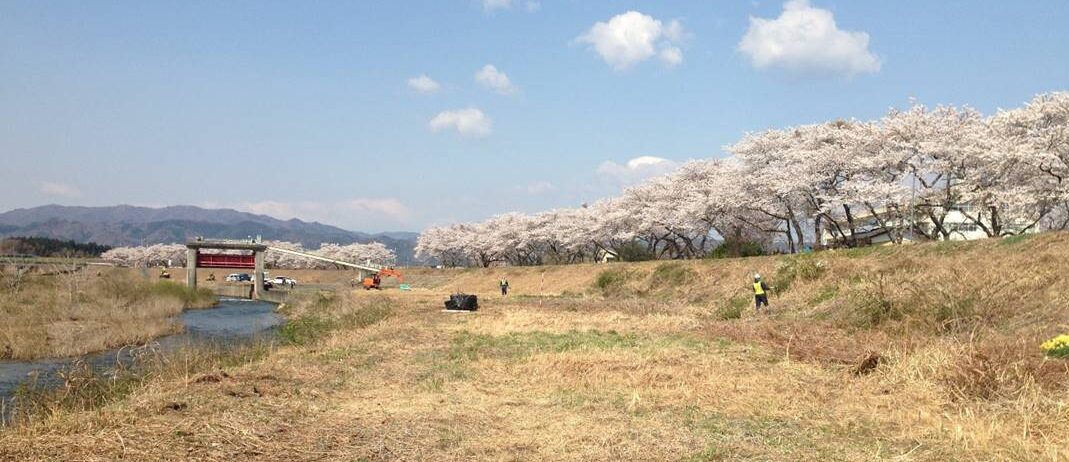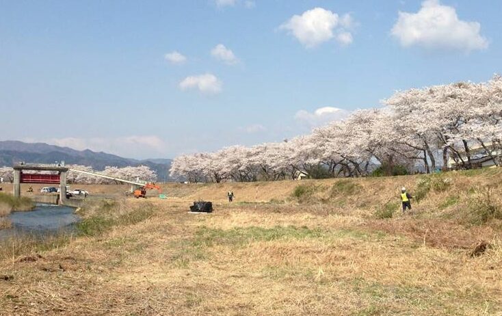 並木のつづく河川敷で、愛でるいとまもなく、無主物に汚染された下草刈りが続けられていました。