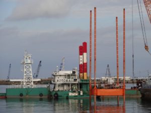 種子島の高速船トッピーが着岸する西之表港の対岸奥では、大型クレーンを装備した自走式大型台船上で調査に必要な機材の積み込みが行われ、その横で調査船(スパット台船・写真中央)の1号機の、更に反対側の新港では、2号機の組み立てが行われ準備が着々と進んでいます。12月10日の夕方、中種町に近い立山公民館で行われた八板西之表市長との意見交換会では、参加者30人から「基地建設が観光に与える影響は」「防衛省の説明では、肝心な所が抜けている」「税金が安くなるとか、交付金が市民全員に配られるとか、様々な情報が飛び交い何を信じていいかわからない」などの意見がでました。その中で、埼玉から移住してきた方から「移住者は、基地がないからこの種子島に移ってきた。基地ができればネットで繋がっている「移住を希望している全国の人たちの相談にのれない。基地が出来れば、移転を考えますよ。移住者全員の意見を聞く場を作るべきです」と、市長に訴えました。ここにきて移住者が反対の声を上げ、集会に参加しはじめたことは大変意義があります。また、実際に馬毛島で漁をしている漁師との意見交換では、11日に防衛省に「調査差し止めを求める」仮処分を東京地裁に申請、18日には塩田知事を相手に同様の行政訴訟を鹿児島地裁に起こし、憲法で保障されている漁業権を争点に、特に知事に対しては、種子島漁協の理事会の手続きに不備があることを、訴えていくとしています。