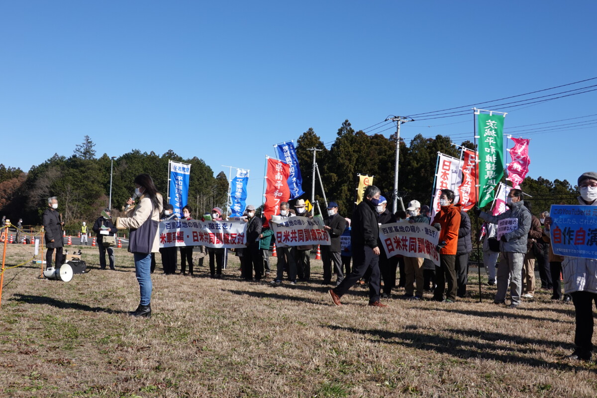 この日米共同軍事訓練に先立ち、百里基地反対連絡協議会と茨城県平和フォーラム、茨城平和擁護県民会議など5団体で構成する平和団体が12月13日午前、百里基地正門前で、日米共同訓練中止を求める集会、申入れ行動を行いました。