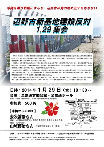 1/29は「沖縄を再び戦場にするな 辺野古の海の埋め立てを許さない 辺野古新基地建設反対1・29集会」