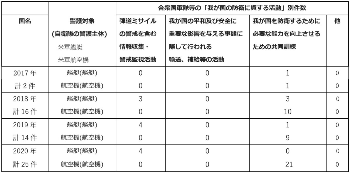 しかし、防衛省は毎年2月に発動件数だけを発表している。限定された情報からわかるのは、海自による米艦艇の防護では、2017年の1回をのぞき、「弾道ミサイルの警戒を含む情報収集・警戒監視活動」の場面で、つまり、実際の任務の中で発動されているということだ。