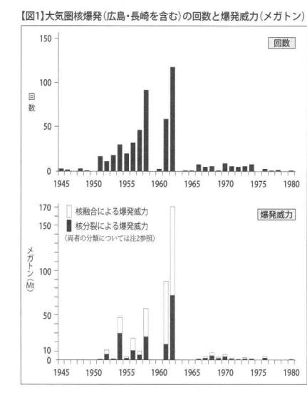 「原子放射線の影響に関する国連科学委員会」(以下、UNSCEAR)の「2000年報告書 放射線の線源と影響 第Ⅰ巻」1、付録Cに基づき大気圏核爆発の各年ごとの回数、及び爆発威力を図1に示した。広島・長崎での戦時使用を含めて1945年は3回であったが、1980年までに543回の核爆発が、米国、旧ソ連、英国、フランス、中国の5か国によって行われた。1951年から1958年、1961年から1962年に多くの実験が行われている。1963年に、米英ソにより大気圏、宇宙、及び海中での核実験を禁止する部分的核実験禁止条約(PTBT)が発効した後は大きく減った。その後の実験は、フランス、中国によるものである。