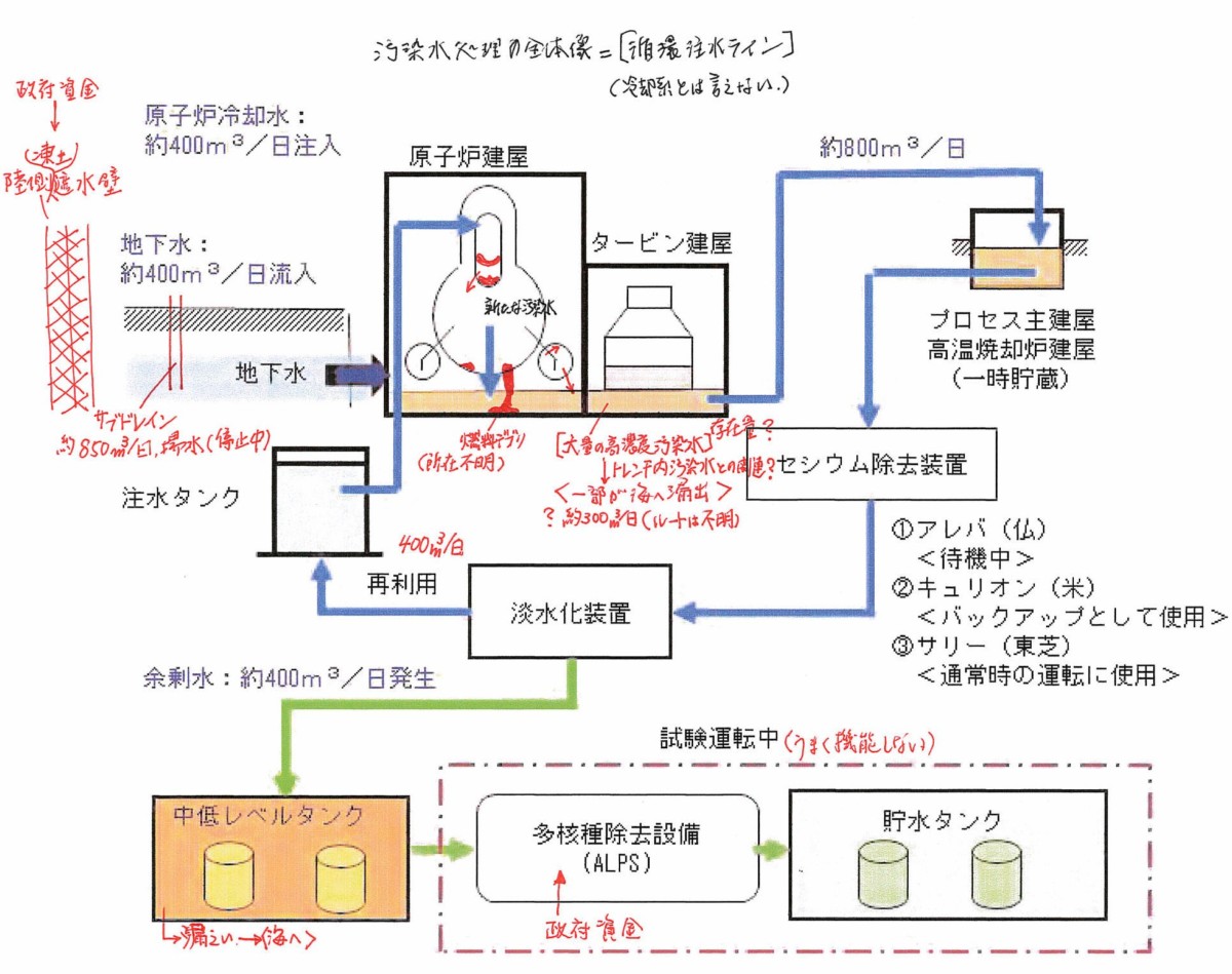 中長期ロードマップ40ページの全体図をもとに、コメントなどを補足したのが図1である。これから以下が読める。タービン建屋にたまっている滞留水から、1日、約800トンの汚染水を取りこみ、セシウム、塩分を除去する装置を通過して淡水とする。その内、約400トンを冷却用として原子炉に注水する。原子炉に入り燃料デブリと接触して汚染された水は、再び原子炉建屋やタービン建屋地下にたまっていく。残りの約400トンは、陸上の中低レベル貯蔵タンクにためていく。初めから閉じて循環する冷却系統などと言うものはなく、注水したものは、すべてそのまま滞留水に入っていくのである。だから「注水ライン」と称している。