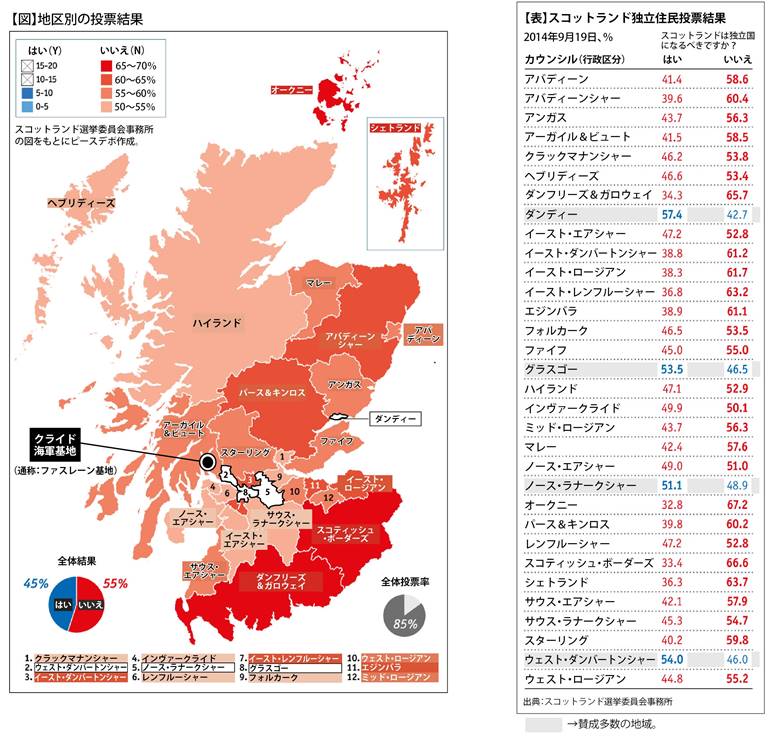 一方で、核兵器が配備されているクライド海軍基地を有するアーガイル・アンド・ビュートでは、41.5%対58.5%で反対多数となった。詳細は不明だが、基地関係者が多く住む地区だけに、クライド海軍基地の存続を求める意識が投票行動に反映されたのかもしれない。