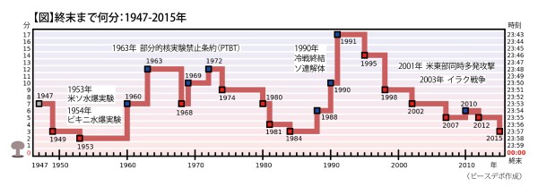 いずれにせよ広島・長崎の被爆から70年、冷静終結からの四半世紀もの年月を経て、三たび終末まで3分前となり、一向に状況は好転していない。終末時計は、人類滅亡までを象徴的に示すものに過ぎないという面はある。しかし、冷戦終結により、核戦争の危機は遠のいたと思われる状況ができたにもかかわらず、2010年に一度、6分前へとやや回復したのを除き、四半世紀の間、基本的に徐々に悪化する方向に向かっている事態を見過ごすことはできない。
