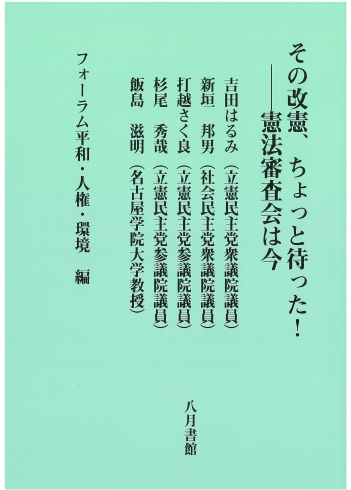 平和フォーラムはこの間、改憲発議をめぐる重要な局面にあることを踏まえ、国会における改憲議論、とりわけ衆参における憲法審査会の動向に注視し情報共有をすすめてきました。 その一環として、昨年11月に新潟市で開催した第60回護憲大会では、新垣邦男さん(社会民主党・衆議院議員)、吉田はるみさん(立憲民主党・衆議院議員)、打越さく良さん(立憲民主党・参議院議員)、杉尾秀哉さん(立憲民主党・参議院議員)をパネリストに、飯島滋明さん(名古屋学院大学教授)をコーディネーターに迎えてシンポジウムを行い、憲法審査会の危険な現状を把握し、改憲発議阻止に向けともにとりくむ決意を確認しました。 このたび、こ