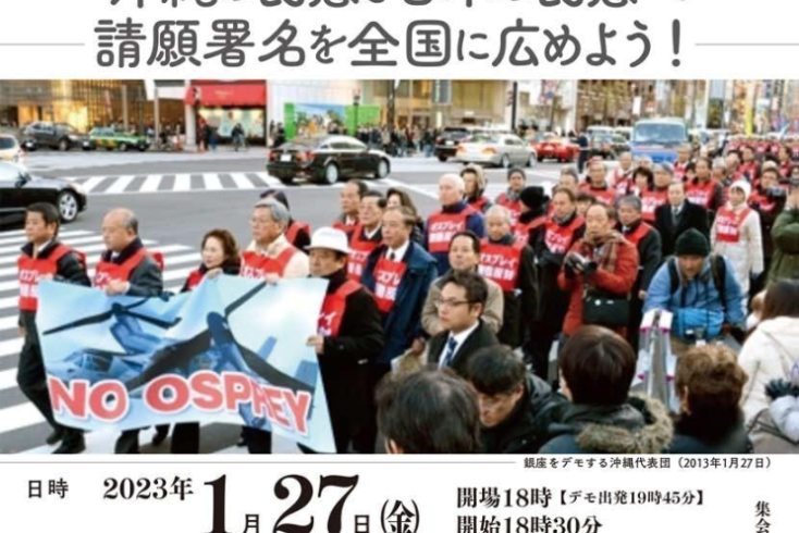 2013年1月27日は、沖縄県の市町村長・市町村議長が、「オスプレイの配備撤回・普天間飛行場の閉鎖・撤去と県内移設断念」を求める「建白書」を携え、日比谷野外音楽堂で集会、銀座でデモ行進をした歴史的な日であり、2023年1月27日はこの日からちょうど10年になります。 辺野古新基地を造らせないオール沖縄会議は、沖縄の民意を無視し続ける政府にあらためて県民の声を届けるために「辺野古新基地建設の断念を求める国会請願署名」のとりくみを開始しました。「止めよう!辺野古埋め立て」国会包囲実行委員会がこの1月27日、沖縄のたたかいに連携し、署名の拡大と基地建設を許さない声を大きく上げていくために集会お