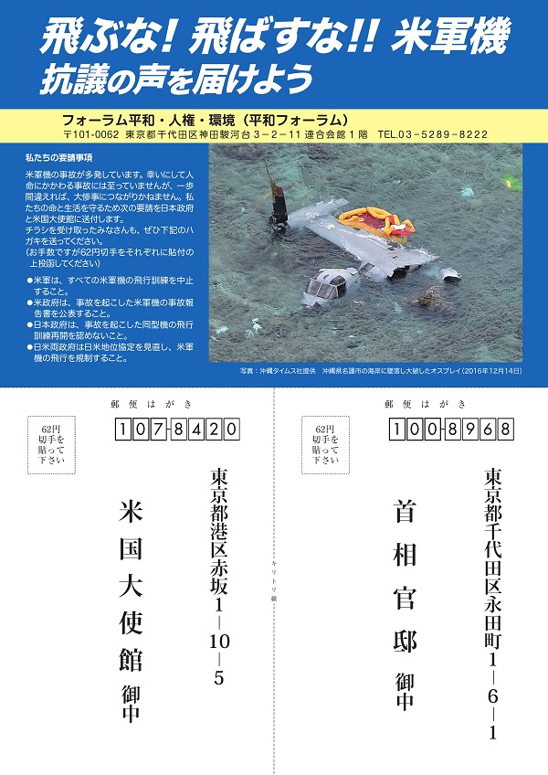 米軍機の墜落や緊急着陸など事故が多発している状況に対して、平和フォーラムは日本政府および米国大使館に抗議の打電行動等にとりくんでいます。