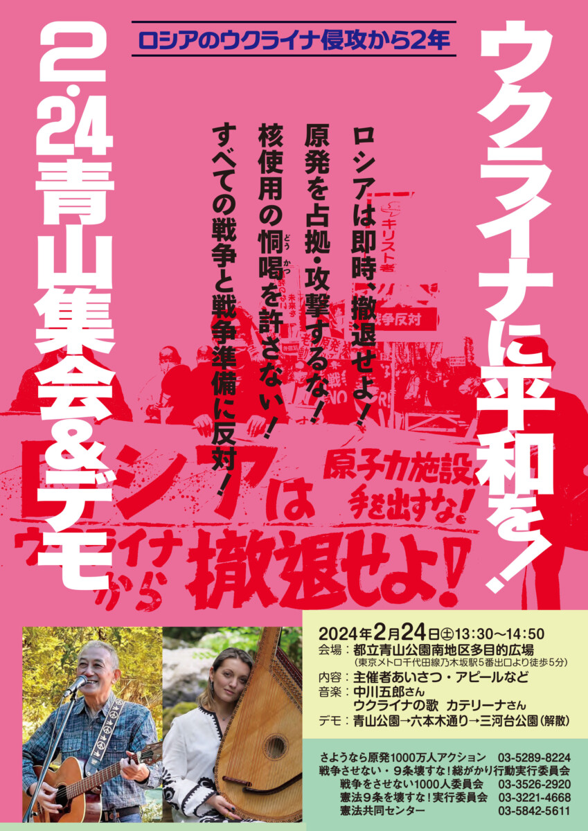 2月24日、「ウクライナに平和を!2.24青山集会&デモ」を、「戦争させない・9条壊すな!総がかり行動実行委員会」、「さようなら原発1000万人アクション」の共催で実施しますので、ご案内いたします。