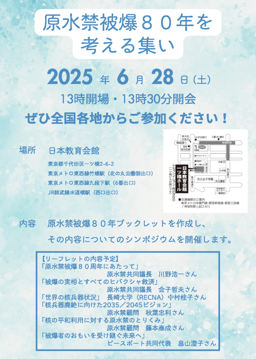 現在、核廃絶に向かっての課題やとりくみの現状をまとめたブックレットを作成していますが、その内容をひろく共有することを目的として、6月28日、東京・日本教育会館にて「原⽔禁・被爆80年を考える集い」を開催します。