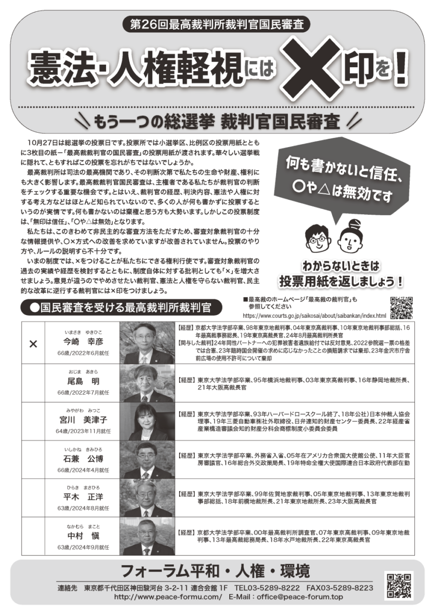 憲法・人権軽視には×印を! 第26回最高裁判所裁判官国民審査